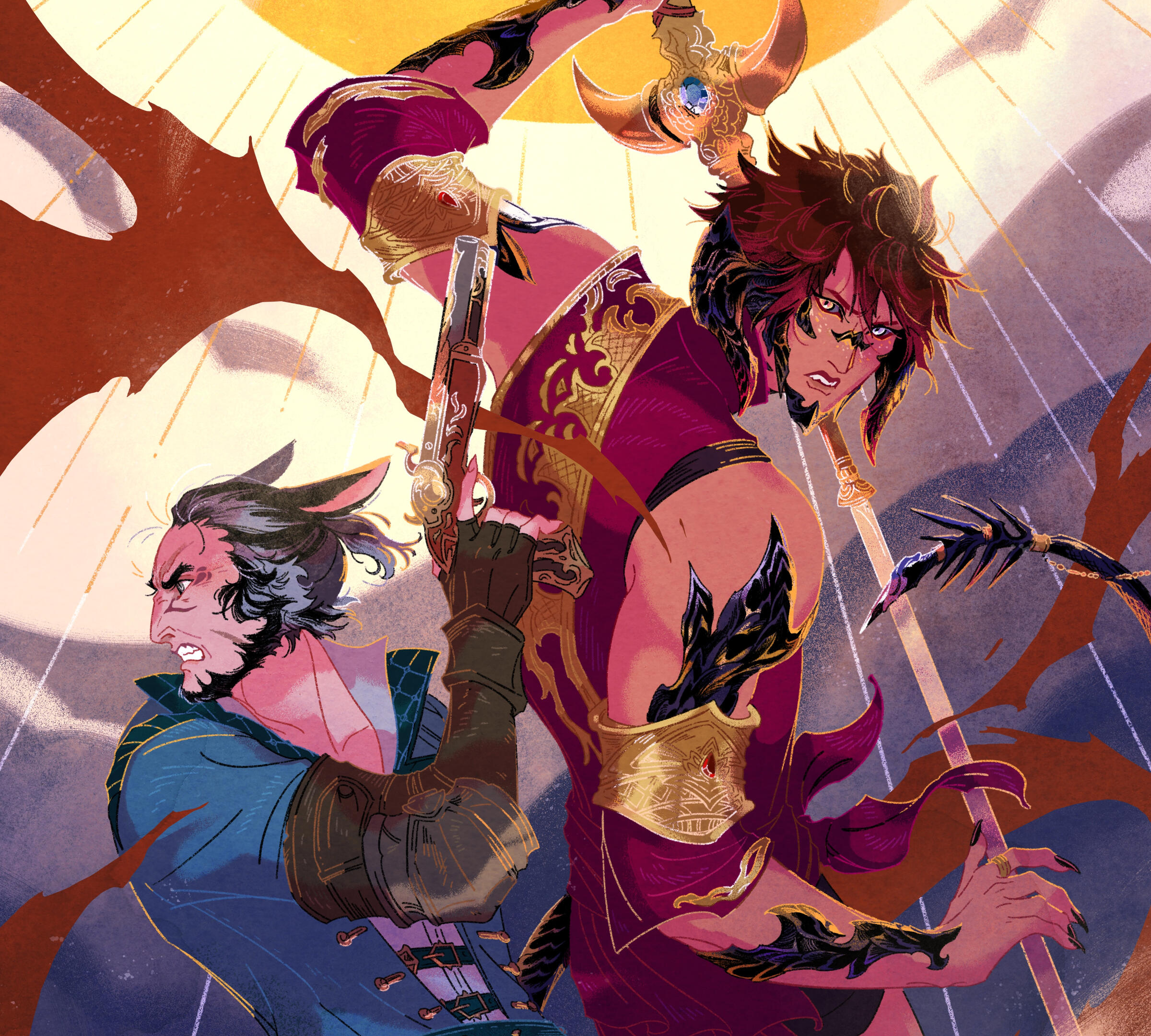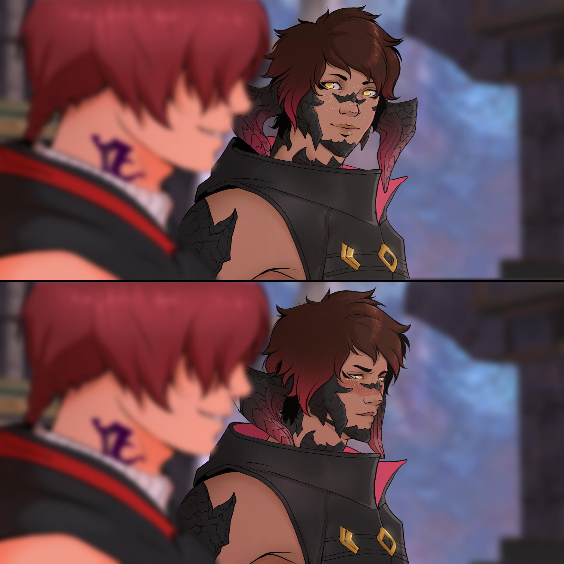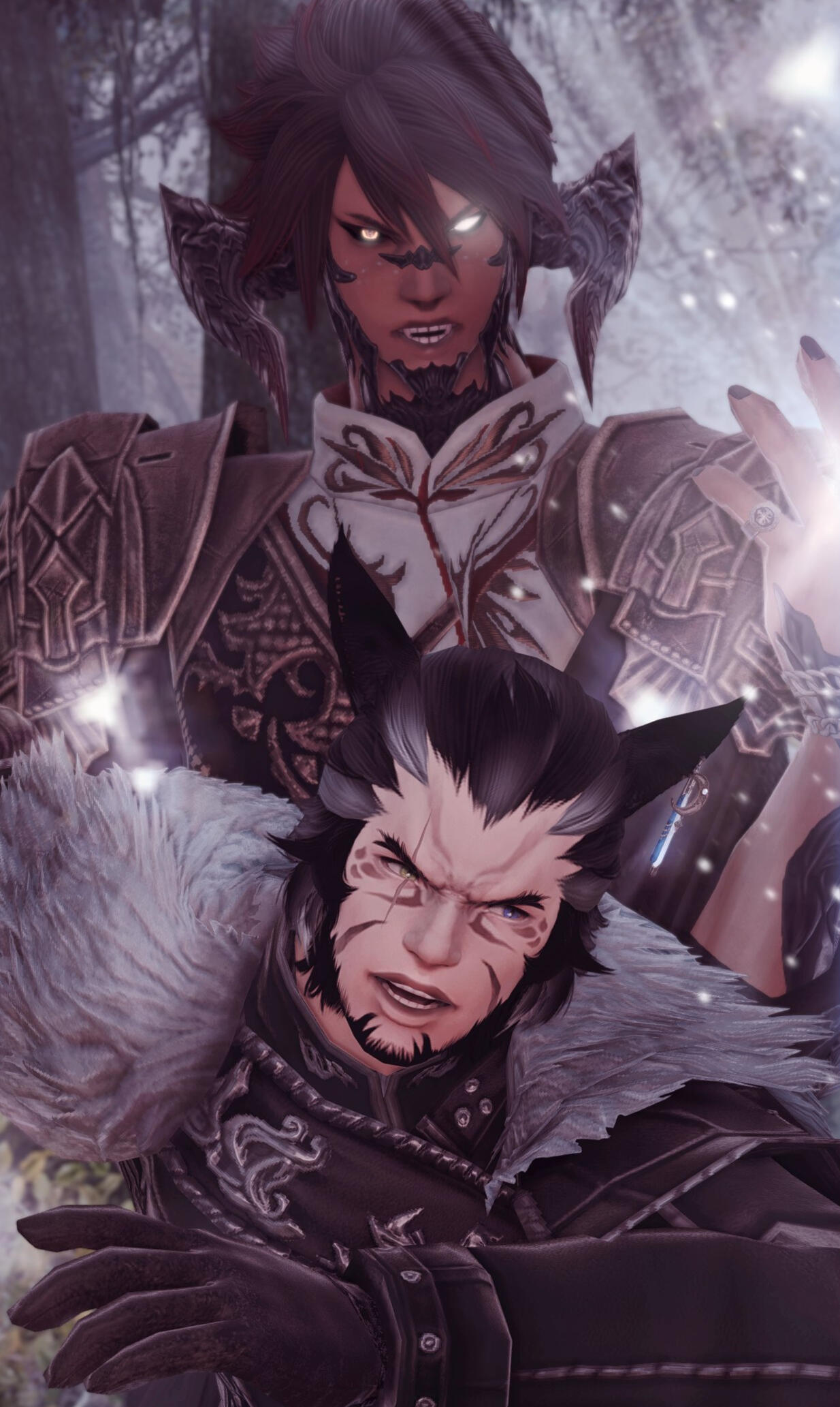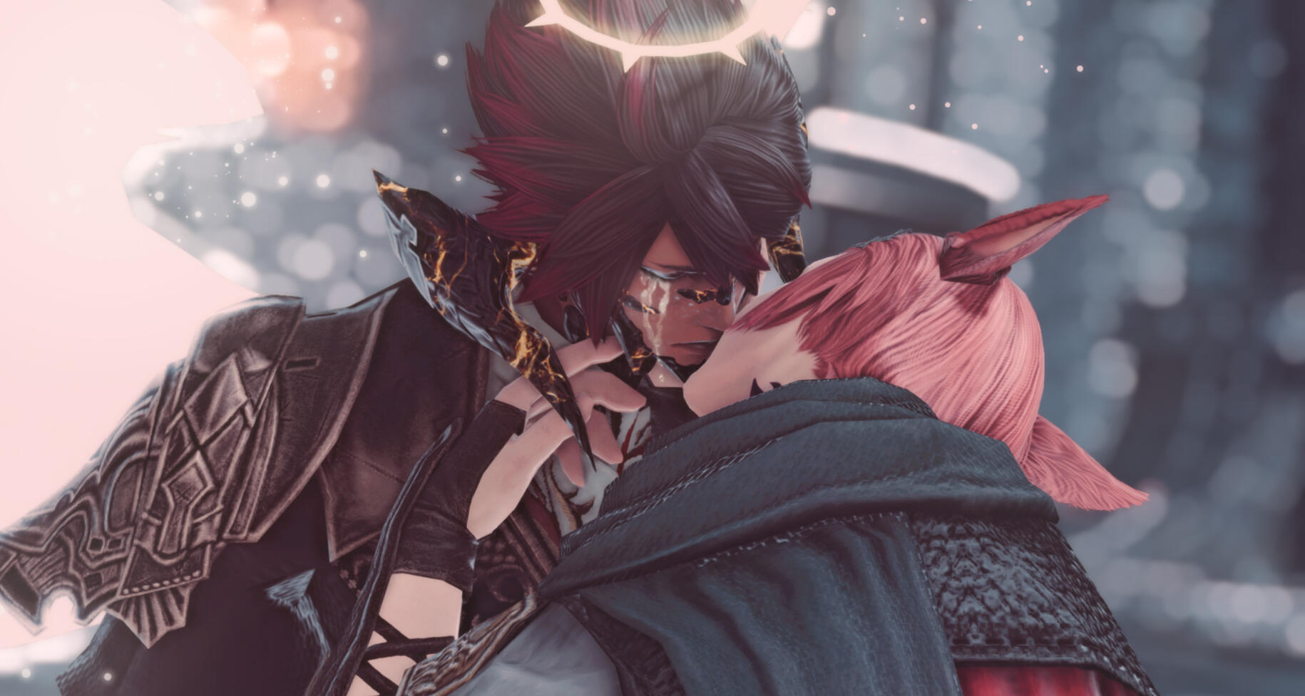 THE CRYSTAL TOWERG'raha Tia’s first impression of Khaliun was, truthfully, a little underwhelmed. He had heard of Khal's recent exploits and was excited to meet this Warrior of Light. However, in person, Khal was quiet and unassuming. Were it not for the rarity of seeing a Xaela in Eorzea, G'raha would not have picked him out as the famed adventurer at all. He didn't have much of a mind for history or books and didn't even realize G'raha had been the one teasing him throughout his quest to collect the aethersands. Their relationship started on the wrong foot, awkward and with mismatched expectations.Khal, however, almost instantly developed a crush on G'raha. He was taken in by the Miqo'te scholar's passion and enthusiasm, easily charmed by G'raha's confident performance. Khal's lack of experience with personal relationships left him falling hard and fast into puppy love and he wasn't adept enough at managing those emotions to reign in his feelings. So he pined desperately, too shy and uncertain to voice his affection, and tried to silently impress G’raha with his fighting abilities.Over the course of exploring the Tower, G'raha did begin to develop a genuine fondness for Khal. He realized that Khal was incredibly sincere and interested in helping G'raha succeed. Despite not comprehending a lot of Allagan history, Khal was a good listener and didn't mind letting G'raha talk for bells about what they might find in the Tower. He shared in G'raha's excitement and routinely offered to help G'raha with small tasks. They enjoyed each other's company and spent many nights looking at the Tower from their camp in Mor Dhona.It was Khal's first crush and an excellent distraction from the increasingly more complicated political dealings of the Scions. The more that G'raha began to reciprocate the attention that Khal was giving him, the more Khal began to believe he might actually have a chance at a real relationship–but then G'raha sealed himself inside the Crystal Tower.Khal was absolutely devastated. On one hand, he understood that they both had responsibilities larger than themselves and that this was not a personal failing. He realized that if he intended to keep being the Warrior of Light he too would have to make sacrifices and sometimes give up his own happiness for the greater good. But also… he was eighteen years old and just had his first real heartbreak. He let that bitter hurt fester. He felt stupid that he thought someone might actually be interested in him, ashamed of the self delusion and private fantasies. All those harbored feelings were ripped away so suddenly and he had been too much of a coward to at least confess them before G'raha closed the door–maybe then he would have felt more closure.Embarrassed by his own emotions, he buried them deep down and threw himself back into Scion work. Killing primals came far easier to him than attempting to navigate interpersonal relationships anyway. He never told anyone that he was close to G'raha. The Scions didn’t notice anything wrong with him, he just seemed as quiet as ever.